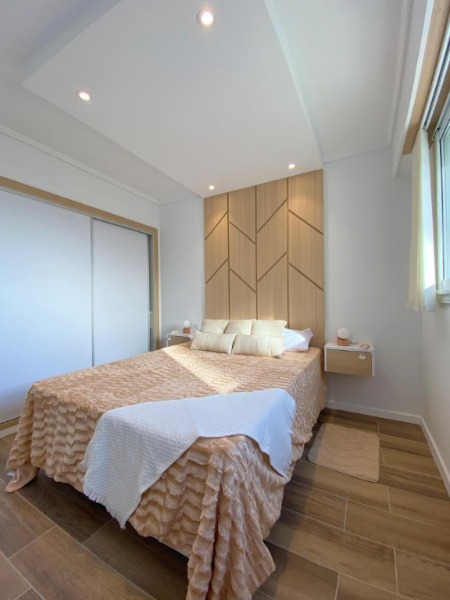 🛌 Dormitorio con pisos porcelanatos, con placard. Con sommier y respaldo. Mesas de luz.