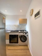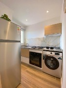 🧑🍳 Amplia cocina separada con cortinas ROLLER, en tela Screen SHEER 5% equipada con heladera con frezzer y lava ropas